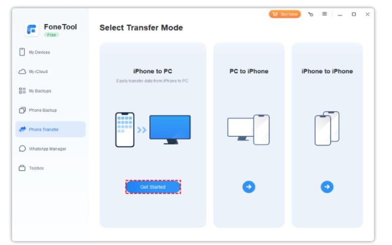 Step 2. Download and launch FoneTool on your computer. Go to “Phone Transfer” from the main interface. Select “iPhone to PC” and click “Get Started“.